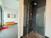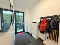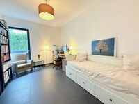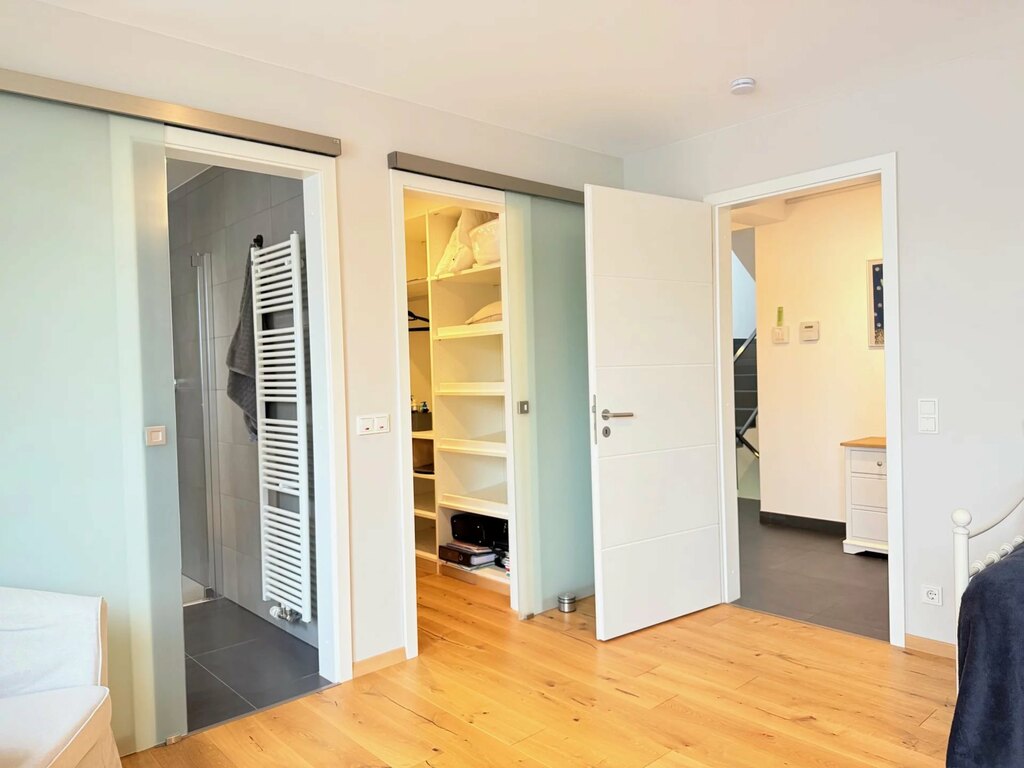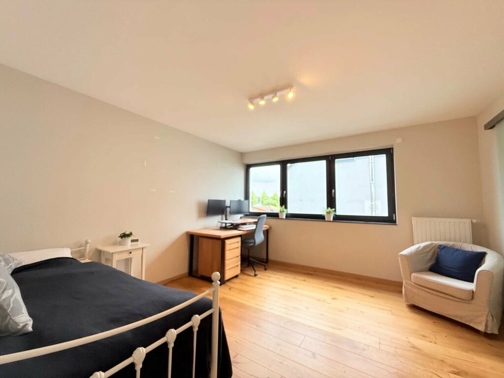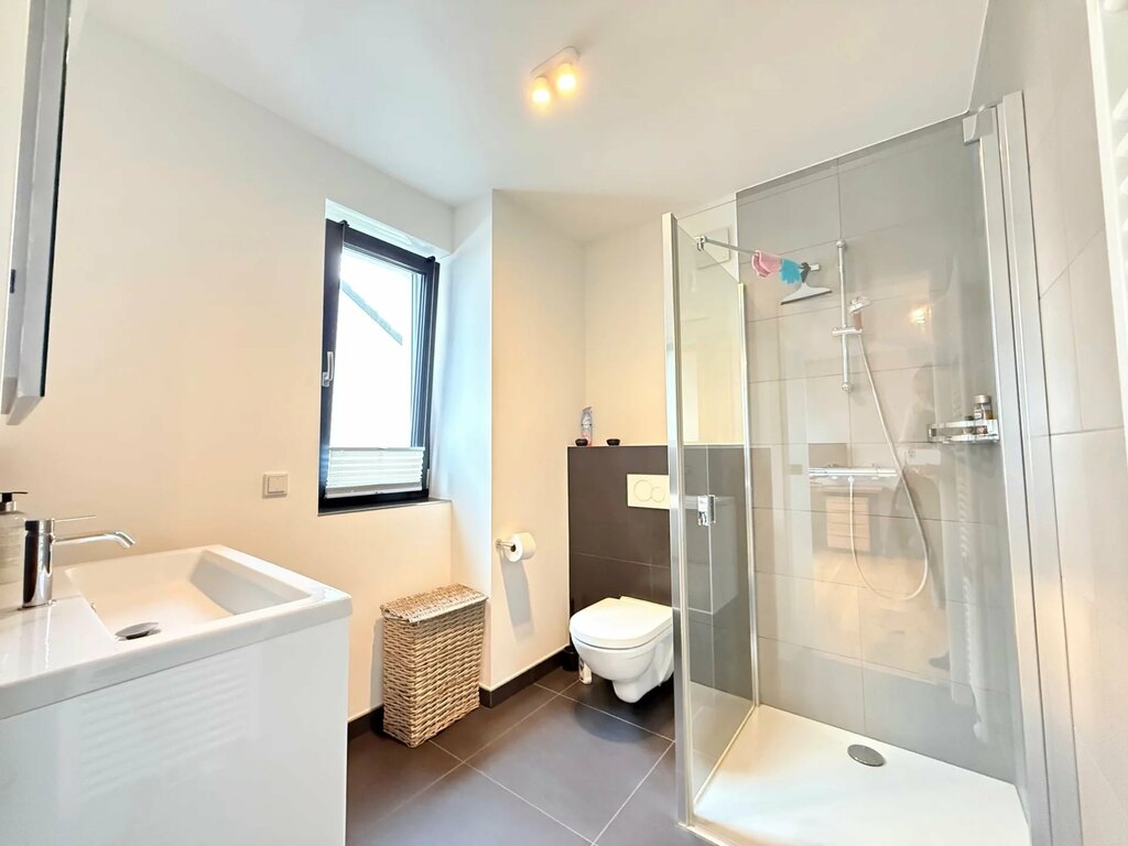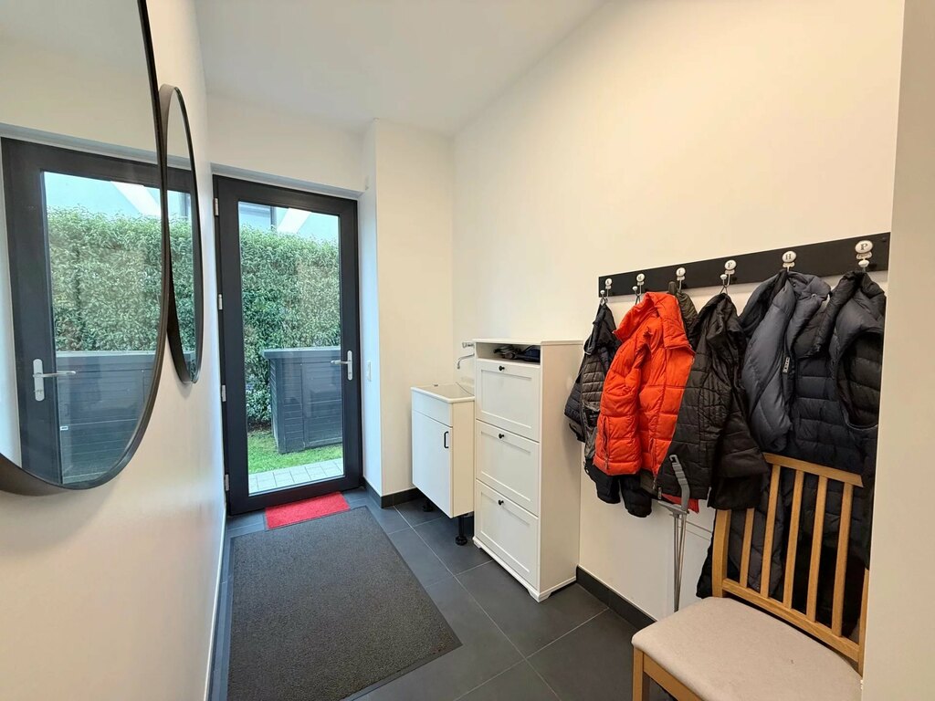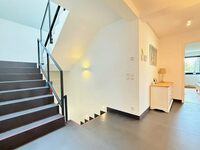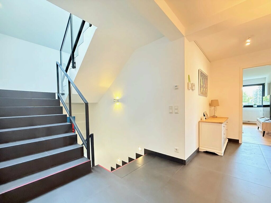 Au rez-de-chaussée : L'entrée principale, avec ses 3 m de hauteur sous plafond, dispose de spacieux placards intégrés et de toilettes invités (avec douche). Vous profiterez également d'une belle vue sur le jardin à l'arrière. En entrant, vous trouverez à droite un bureau avec une porte-fenêtre, tandis qu'à gauche, une porte mène au garage, qui donne également sur l'abri voiture. Le garage est équipé d'une borne de recharge électrique.