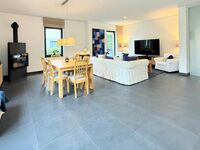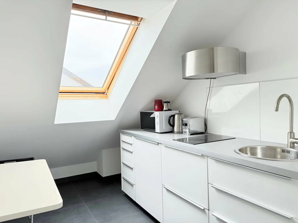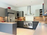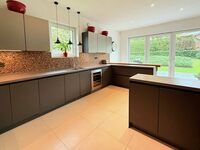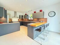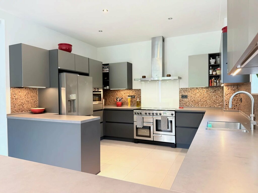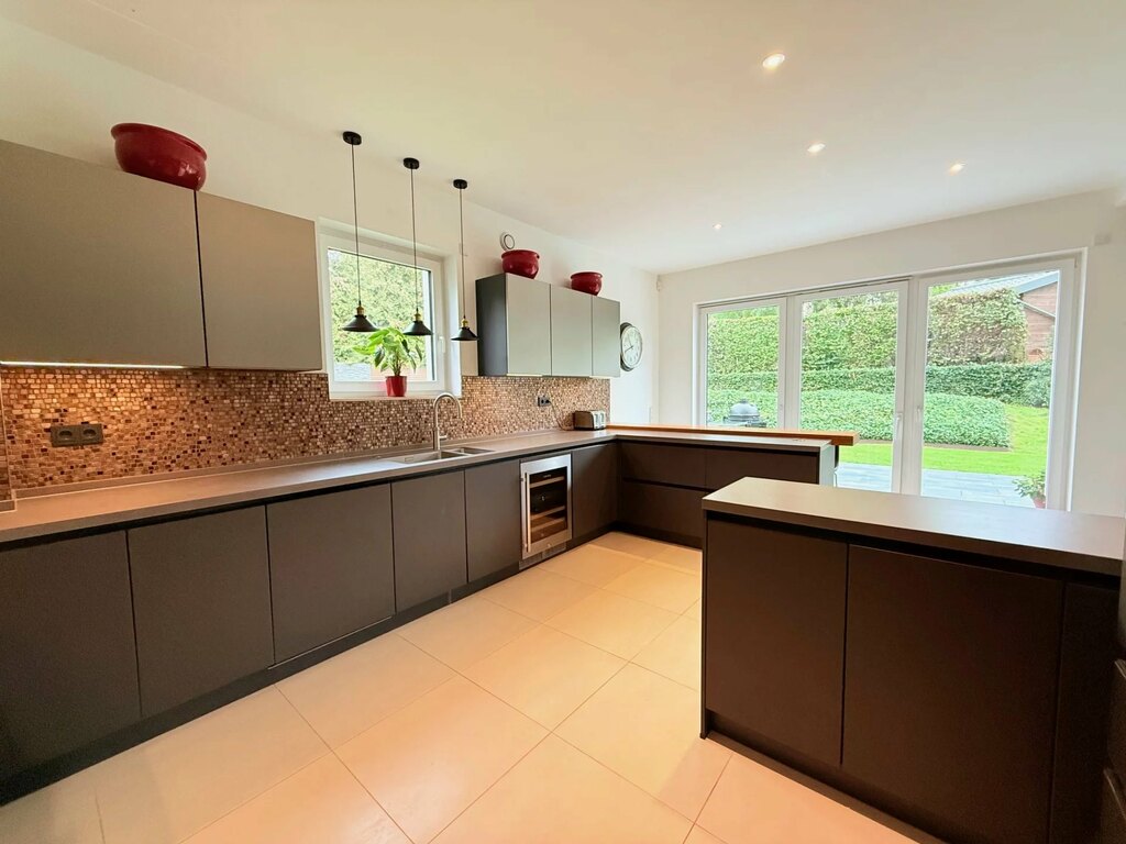 Détail de la cuisine : Cuisine neuve (fin 2021) avec plan de travail en Neolith (Pietra di Piombo). Un matériau ultra-hygiénique et résistant aux rayures, supportant des températures très élevées (1 000 °C), vous pouvez donc y poser une casserole chaude en toute sécurité ; garantie 25 ans. Elle est équipée d'une plaque de cuisson à induction Falcon extra-large (plaque de cuisson et deux fours), d'un troisième four/micro-ondes Bosch séparé, d'un robinet d'eau bouillante Quooker intégré, d'un réfrigérateur-congélateur américain AEG avec distributeur d'eau et de glaçons et d'une cave à vin avec deux compartiments séparés à température contrôlée. L'espace est fluide, ouvert mais structuré, idéal pour une cuisine conviviale comme pour des dîners raffinés.
