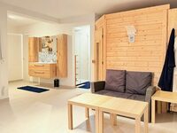 Vous passez ensuite un escalier à gauche, puis à droite une seconde entrée – la salle d'eau – avec placards et évier pour rincer le chien et les bottes après une belle promenade en forêt. Une grande porte vitrée mène ensuite au salon/salle à manger ouvert avec poêle à bois et à la cuisine américaine (rails installés et portes coulissantes disponibles pour créer une cuisine séparée). Les grandes portes vitrées permettent de s'intégrer harmonieusement au jardin et à ses vastes terrasses.